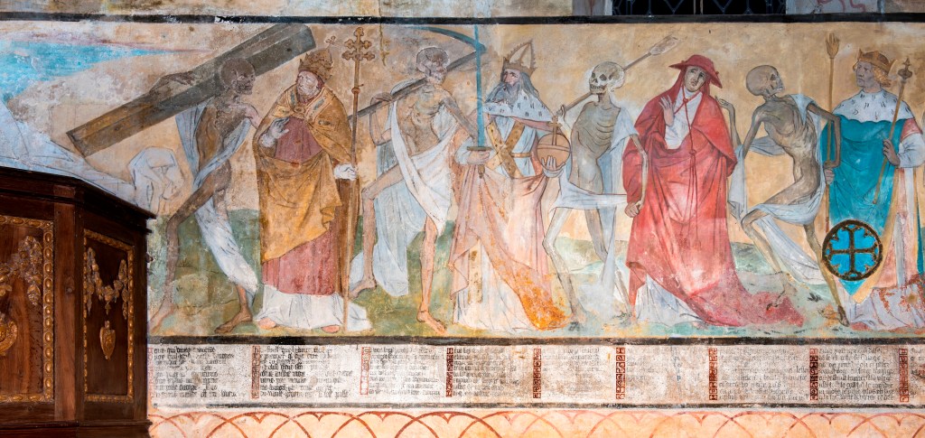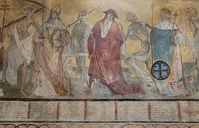 L’église de Meslay-le-Grenet, située en Eure-et-Loir près de Chartres, est à l’origine de la création de l’association Danses macabres d’Europe car elle abrite l’ensemble pictural le plus complet en Occident avec sa Danse macabre, son iconographie du Roi mort, de la Rencontre des trois morts et des trois vifs, des Femmes bavardes ainsi que de six scènes de la Passion.
